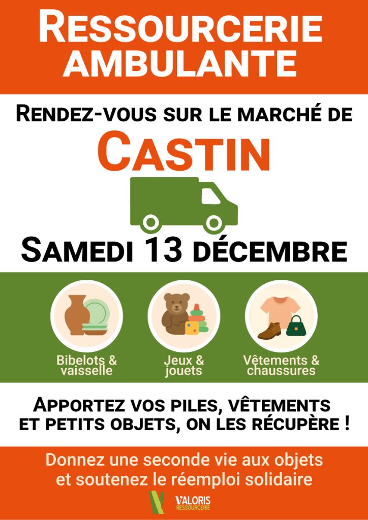 La ressourcerie Valoris est présente un samedi sur 2 à Castin, vous trouverez des vêtements et autres bibelots mais aussi vous pourrez déposer piles usagées, vêtements, petit électroménager.