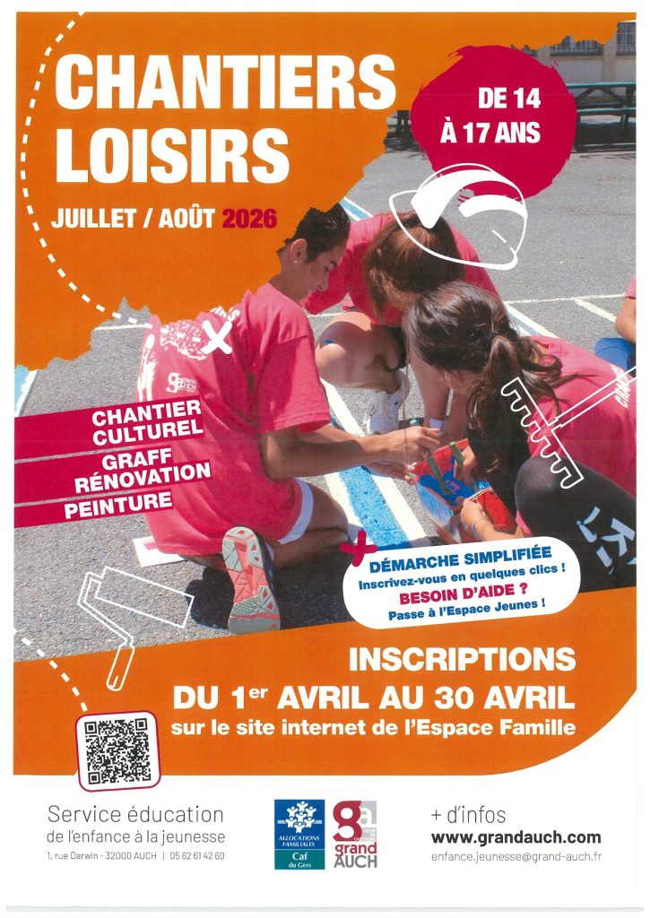 CHANTIERS LOISIRS DE 14 A 17 ANS INSCRIPTIONS DU 1er AVRIL AU 30 AVRIL 2026